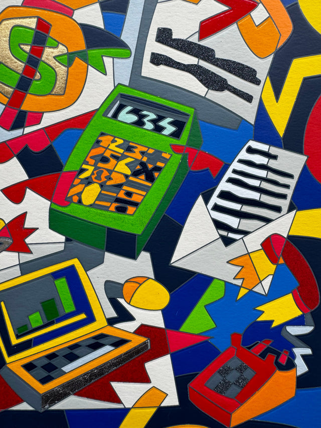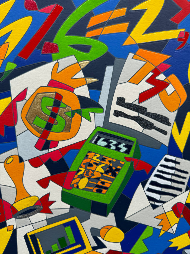 Questa creazione è un'esplosione di forme e colori, un gioco dinamico di elementi che sembrano danzare sulla carta. La sua composizione vivace invita lo spettatore a esplorare ogni dettaglio, rivelando sempre nuove sfumature. Lasciatevi rapire dall'audace gioco cromatico che sembra raccontare una storia di movimento e vitalità.