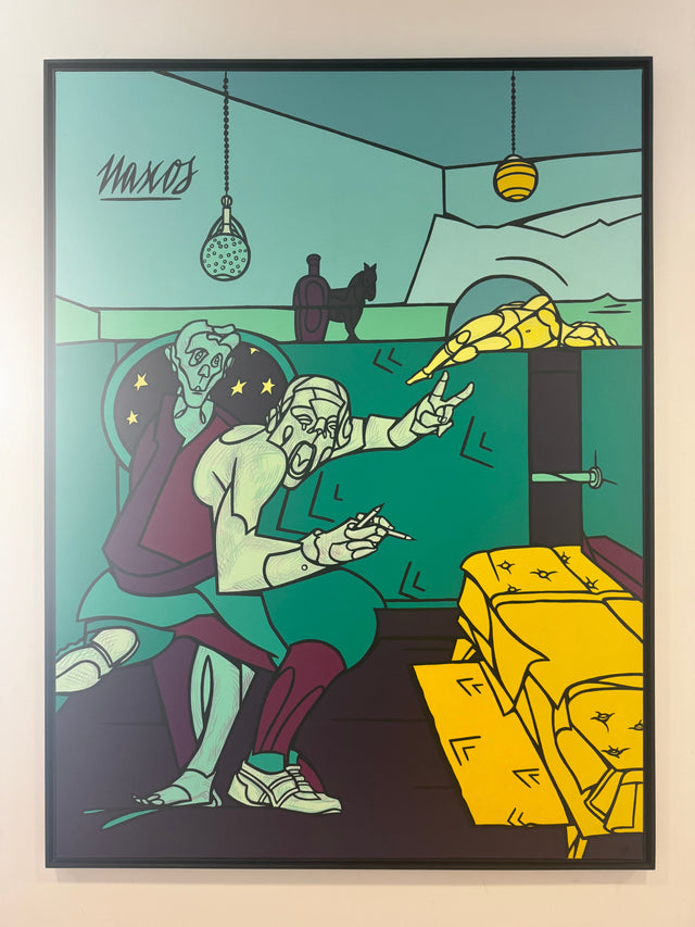 Starting from an expressionist painting influenced by the work of Francis Bacon, and by American Pop Art and in particular by Roy Lichtenstein, developing a sort of fantastic comic story.