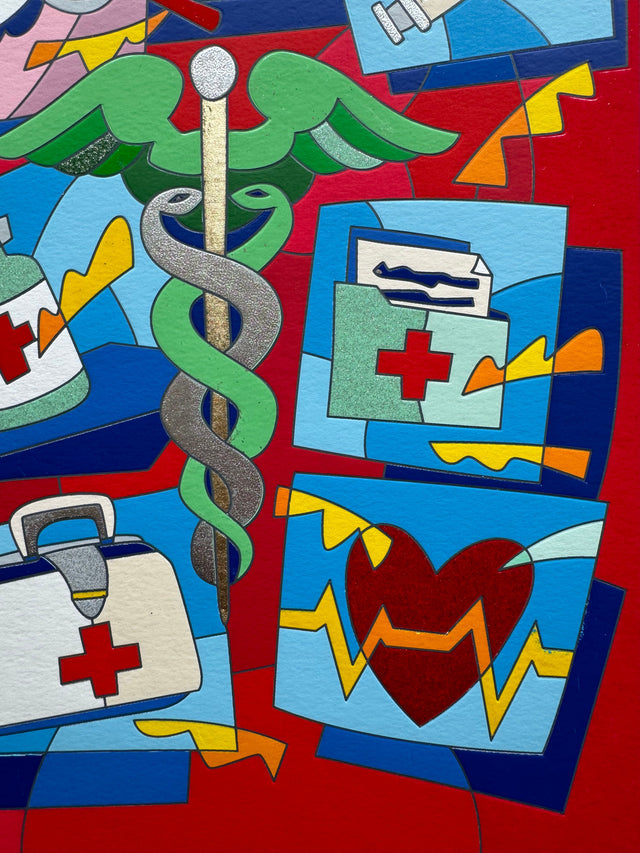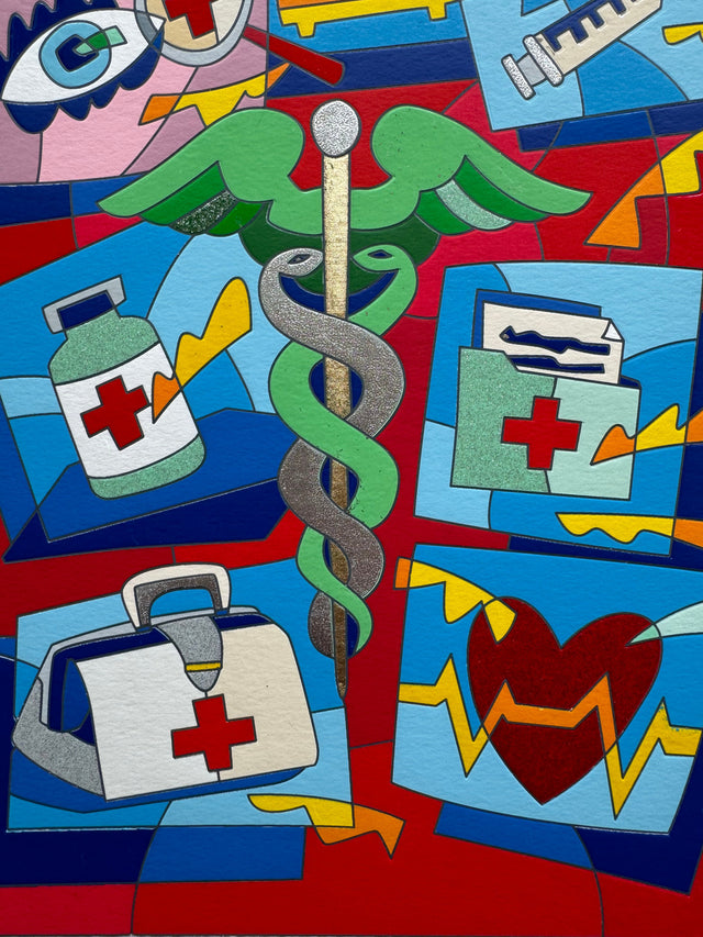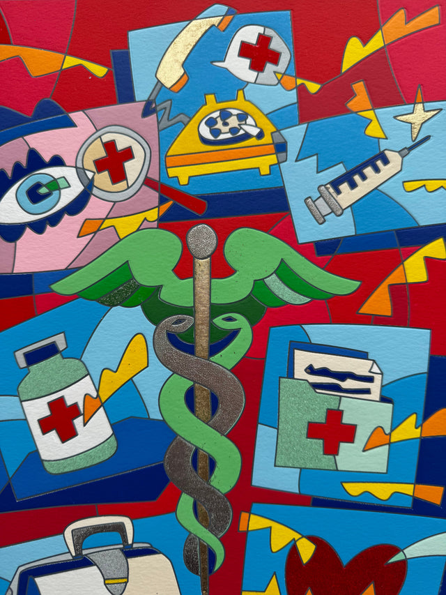 L'artista, noto per il suo stile vivace e le composizioni ricche di simbolismo, riesce a trasmettere un senso di dinamismo e modernità. Questa opera evoca un viaggio nei mondi della medicina e della cura. I colori audaci e le linee decise invitano a riflettere sulla connessione tra salute e società.