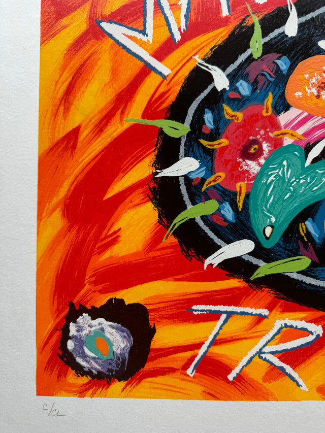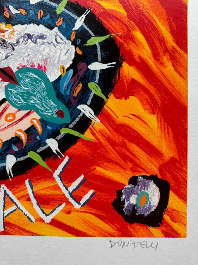 Serigrafia del maestro Bruno Donzelli, la sua è una pittura narrativa, vivacissima anzi scoppiettante, che si nutre di spietate rivisitazioni, più che di citazioni.