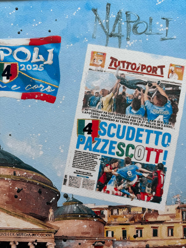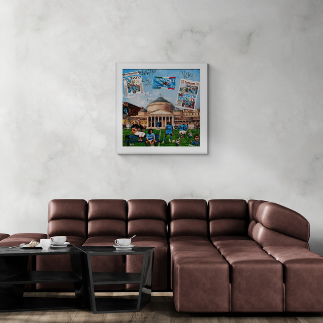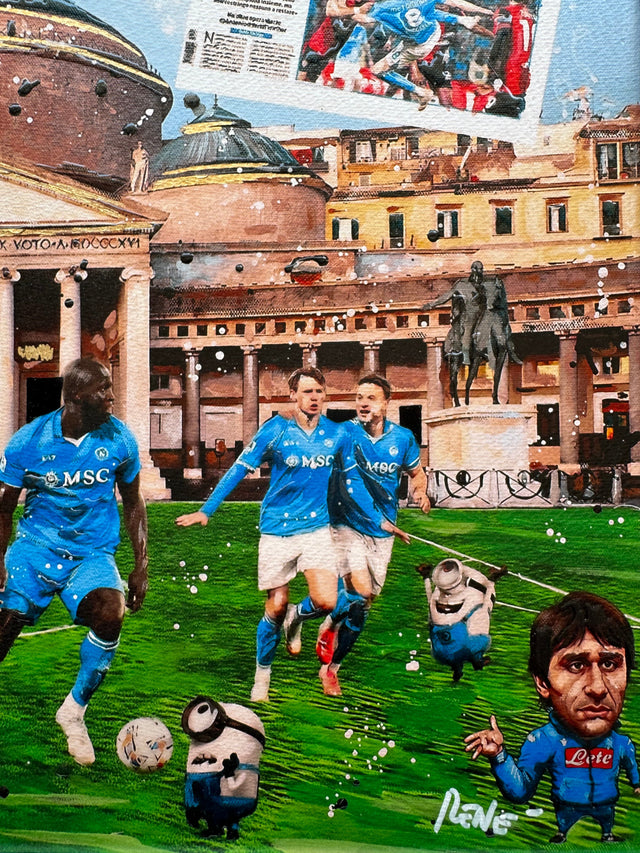 L'artista Renè, con il suo stile unico e inconfondibile, riesce a catturare l'anima e il cuore della città. Le sue opere sono un omaggio vibrante alla cultura e alla passione di un popolo, manifestando emozioni profonde e coinvolgenti. Questo capolavoro richiama alla mente la gioiosa celebrazione di una comunità, esprimendo attraverso colori vivaci e dettagli curati l'amore viscerale per il calcio e la vita. La scena ritratta fonde abilmente realtà e sogno, invitando l'osservatore a perdersi in un mondo di entusiasmo e appartenenza.