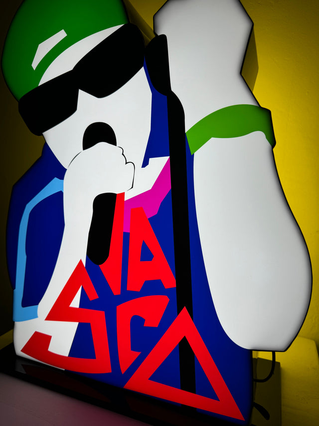 Splendida scultura luminosa del Maestro Marco Lodola, dove gioia e divertimento, magia e fantasia, sono gli ingredienti che caratterizzano il suo percorso creativo. In questa scultura luminosa lavorata in perspex, l'anima pop di Lodola si manifesta appunto per stare in mezzo a noi, parlando con semplicità il nostro linguaggio.